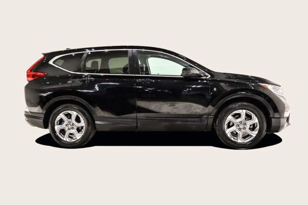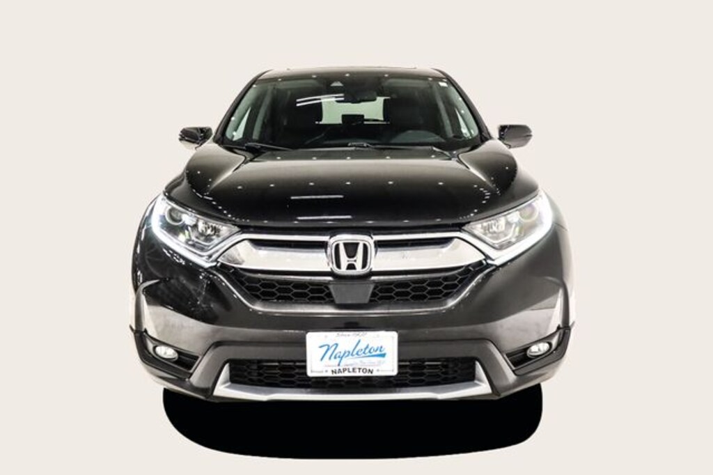 This CR-V is well equipped with 18" Alloy Wheels, 4-Wheel Disc Brakes, 5.64 Axle Ratio, 8 Speakers, ABS brakes, Air Conditioning, Alloy wheels, AM/FM radio: SiriusXM, Apple CarPlay/Android Auto, Auto High-beam Headlights, Auto-dimming Rear-View mirror, Automatic temperature control, Blind Spot Information (BSI) System warning, Brake assist, Bumpers: body-color, Compass, Delay-off headlights, Driver door bin, Driver vanity mirror, Dual front impact airbags, Dual front side impact airbags, Electronic Stability Control, Exterior Parking Camera Rear, Four wheel independent suspension, Front anti-roll bar, Front Bucket Seats, Front Center Armrest, Front dual zone A/C, Front fog lights, Front reading lights, Fully automatic headlights, Garage door transmitter: HomeLink, Heated door mirrors, Heated Front Bucket Seats, Heated front seats, Illuminated entry, Leather Seat Trim, Leather Shift Knob, Low tire pressure warning, Memory seat, Occupant sensing airbag, Outside temperature display, Overhead airbag, Overhead console, Panic alarm, Passenger door bin, Passenger vanity mirror, Power door mirrors, Power driver seat, Power Liftgate, Power moonroof, Power passenger seat, Power steering, Power windows, Radio data system, Radio: AM/FM/HD/SiriusXM Audio System, Rear anti-roll bar, Rear seat center armrest, Rear window defroster, Rear window wiper, Remote keyless entry, Security system, Speed control, Speed-sensing steering, Speed-Sensitive Wipers, Split folding rear seat, Spoiler, Steering wheel mounted audio controls, Tachometer, Telescoping steering wheel, Tilt steering wheel, Traction control, Trip computer, Turn signal indicator mirrors, and Variably intermittent wipers.