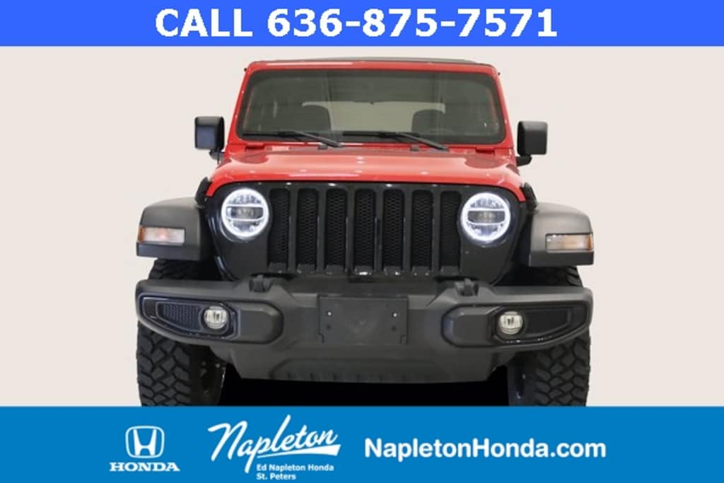 This Wrangler is well equipped with LED Headlamp & Fog Lamp Group (Front LED Fog Lamps and LED Premium Reflector Headlamps), Quick Order Package 22W Willys (4-Wheel Drive Swing Gate Decal, 7.0" Touchscreen Display, 97 MPH Vehicle Max Speed Calibration, Air Conditioning, Anti-Spin Differential Rear Axle, Apple CarPlay, Automatic Headlamps, Black Grille, Black Trail Rated Badge, Bridgestone Brand Tires, Deep Tint Sunscreen Windows, Front 1-Touch Down Power Windows, Global Telematics Box Module (TBM), Google Android Auto, GPS Antenna Input, Integrated Center Stack Radio, Integrated Voice Command w/Bluetooth, Leather Wrapped Steering Wheel, Matte Black Jeep Badge, Mold In Color Bumper w/Gloss Black, MOPAR All-Weather Floor Mats, Power Heated Mirrors, R1234YF A/C Refrigerant, Radio: Uconnect 4 w/7" Display, Remote Keyless Entry, Security Alarm, SiriusXM Guardian-Included Trial (B), Speed Sensitive Power Locks, Sun Visors w/Illuminated Vanity Mirrors, USB Host Flip, Wheels: 17" x 7.5" Moab Black Aluminum, Willys, and Willys Hood Decal), 3.45 Overall Top Gear Ratio, 4-Wheel Disc Brakes, 8 Speakers, ABS brakes, AM/FM radio, Auxiliary Battery, Brake assist, Cloth Low-Back Bucket Seats, Compass, Delay-off headlights, Driver door bin, Driver vanity mirror, Dual front impact airbags, Dual front side impact airbags, Electronic Stability Control, Emergency communication system: SiriusXM Guardian, Engine Oil Cooler, Front anti-roll bar, Front Bucket Seats, Front Center Armrest w/Storage, Front fog lights, Front reading lights, Integrated roll-over protection, Low tire pressure warning, Non-Locking Fuel Cap w/o Discriminator, Normal Duty Suspension, Occupant sensing airbag, Outside temperature display, ParkView Rear Back-Up Camera, Passenger door bin, Passenger vanity mirror, Power steering, Radio data system, Radio: Uconnect 3 w/5" Display, Rear anti-roll bar, Rear reading lights, Speed control, Start-Stop Dual Battery System, Steering wheel mounted audio controls, Tachometer, Telescoping steering wheel, Tilt steering wheel, Traction control, Trip computer, Variably intermittent wipers, and Wheels: 17" x 7.5" Black Steel Styled.