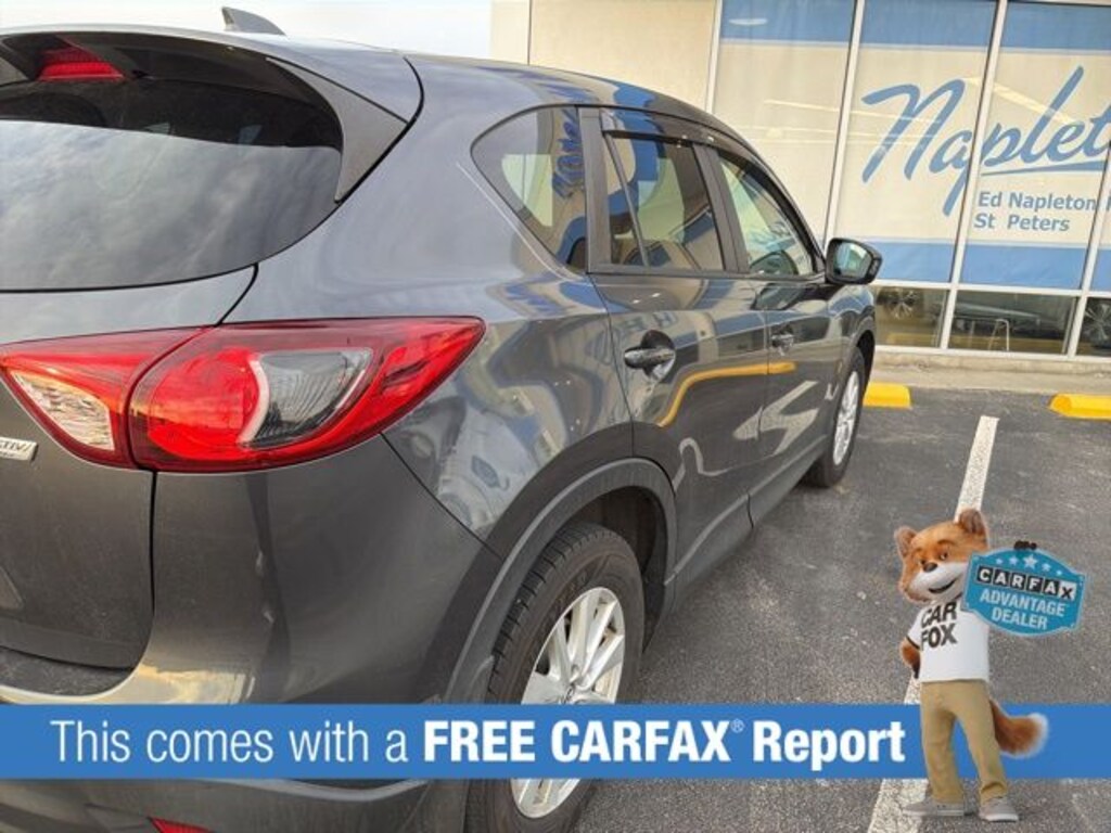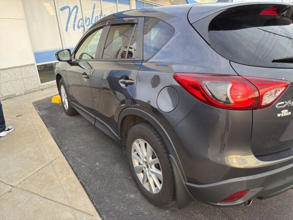 The exterior of this CX-5 Touring is adorned in a sophisticated Gray finish, complemented by sleek 17-inch alloy wheels and a sporty rear spoiler. Step inside and you'll be greeted by a well-appointed cabin featuring high-quality cloth seating, a leather-wrapped steering wheel, and an intuitive center console layout.